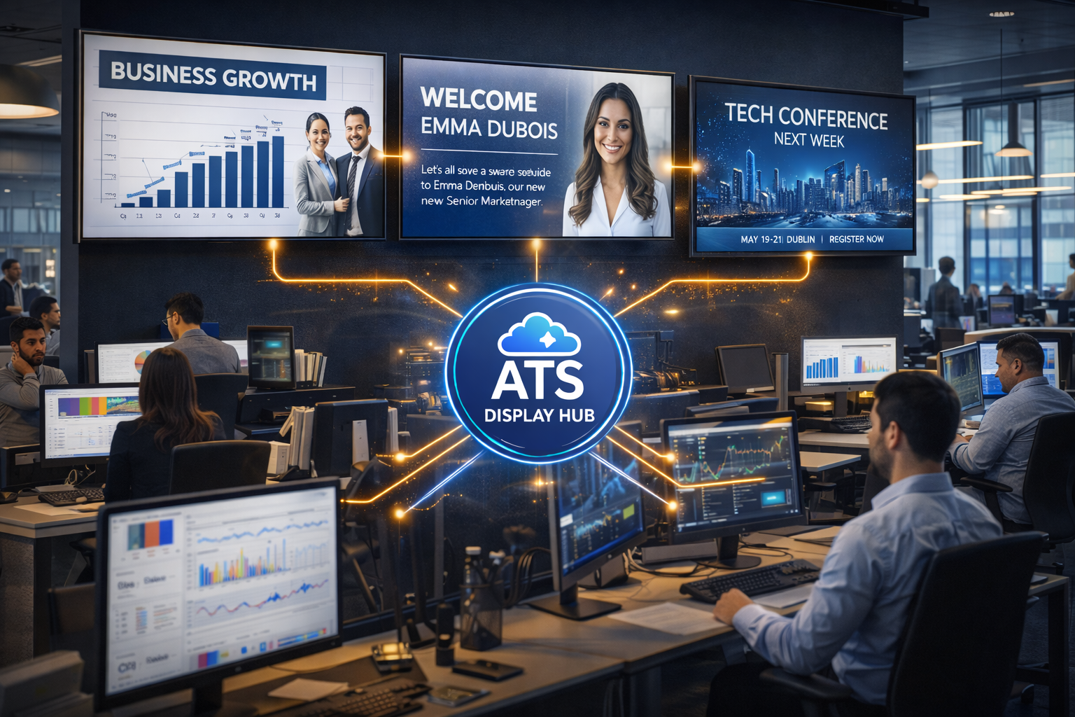 ATS déploie des solutions d’affichage dynamique professionnelles pour diffuser vos messages, informations et contenus sur un ou plusieurs écrans, de manière simple et centralisée grâce à ATS Display Hub. Améliorez votre communication et valorisez votre image auprès de vos clients et collaborateurs.